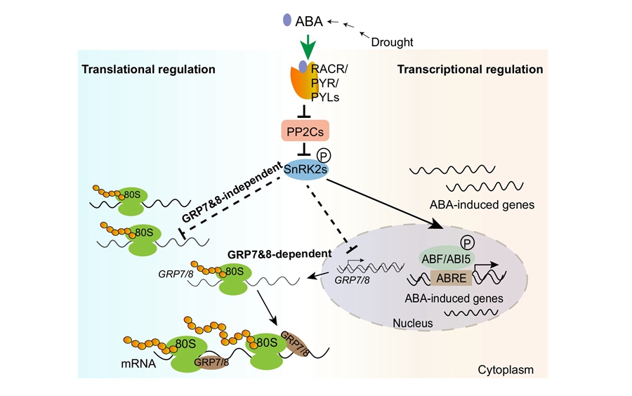 Joint analysis of Ribo-seq and CLIP-seq data showed that GRP7 directly binds to its target mRNAs, playing a key role in ABA-mediated translation regulation. Additionally, the regulation of mRNA translation efficiency under drought stress partially depends on the ABA-GRP7&8 pathway. This research has unveiled the molecular mechanisms of GRP7&8 in ABA signal-mediated translation regulation, offering new insights into ABA-mediated environmental adaptability. The GRPs proteins are highly conserved in Arabidopsis and cereal crops, making these findings potentially valuable for improving crop stress resistance and providing new directions for studying the molecular mechanisms of crop stress responses.