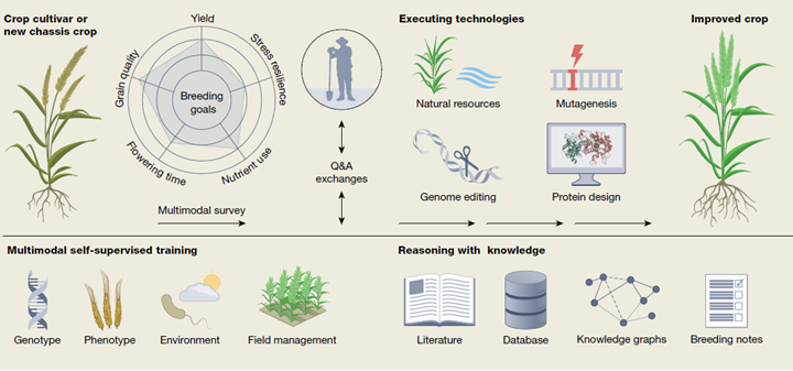 This review explores the integration of multi-omics, genome editing, protein design, and high-throughput phenotyping (HTP) as part of a comprehensive vision for “AI + BT” (biotechnology) integration to genetically improve crops. The authors present a forward-looking framework for AI-assisted crop germplasm design, offering a clear roadmap for the future of sustainable agriculture.