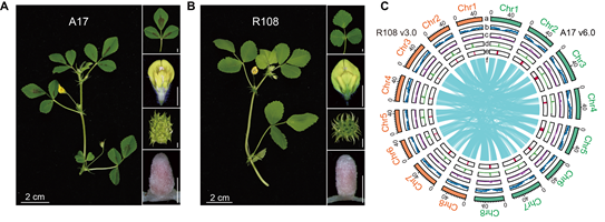 Using a combination of PacBio HiFi sequencing, ultra-long Oxford Nanopore reads, and Hi-C chromatin conformation capture, the team successfully constructed T2T genome assemblies for Medicago truncatula Jemalong A17 (A17 v6.0) and Medicago littoralis R108 (R108 v3.0). These assemblies span 494.47 Mb and 415.27 Mb, respectively, with >99% completeness based on BUSCO assessment, representing the most complete genomes available for the Medicago genus to date.