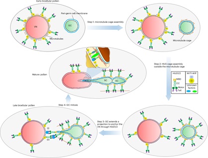 The study, led by teams of Prof. YANG Weicai and Prof. LI Hongju from the Chinese Academy of Sciences identifies two motor proteins, HUG1 and HUG2, form a kinesin cage encasing a microtubule cage around the generative cell or sperm cells and vegetative nucleus that act like molecular arms, to link them together during pollen development. Without these “hugging” proteins, the sperm cells get left behind, leading to complete plant sterility.