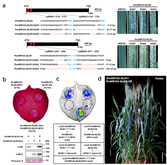 PmWR183 encodes two closely linked nucleotide-binding leucine-rich repeat (NLR) proteins, PmWR183-NLR1 and PmWR183-NLR2, which function only as a pair. Transgenic wheat carrying both genes exhibited strong resistance to powdery mildew, whereas plants expressing either gene alone remained susceptible. Conversely, CRISPR/Cas9-mediated knockout of either gene abolished resistance, confirming their coordinated function.