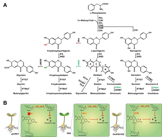 Intriguingly, both knockout and overexpression of GmIF6H1 rendered soybean plants more susceptible to P. sojae: Knockout mutants exhibited compromised defense due to the absence of glycitein, whereas overexpression lines disrupted metabolic flux distribution, leading to impaired glyceollin production. These findings reveal a finely tuned metabolic balance between isoflavonoid branches that optimizes disease resistance in soybeans.